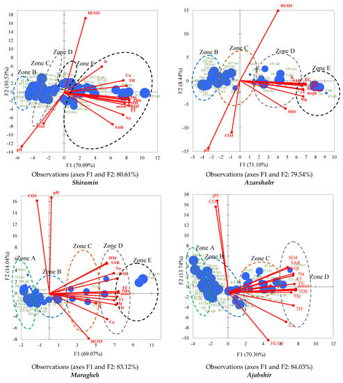 The PCA produced a correlation matrix between all variables and observations (Figure 9). In the Tasuj aquifer, a high positive correlation coefficient was observed between Cl− and Na+ (r = 0.939), and Mg2+ and Ca2+ (r = 0.843). Furthermore, high positive correlations between TDS and EC (r = 0.998), Na+ (r = 0.83), Mg2+ (r = 0.816), Ca2+ (0.867), and TH (r = 0.887) were measured as expected. The correlations for pH and CO32− were negative for almost all the major elements, which reflects the hydro-chemical attributes of the aquifer [60].