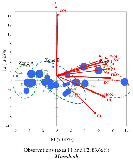 The samples from the semi-deep wells 328 (both seasons), 71 (wet season), 81, and 151 (dry season), qanats 76 and 322, and spring 234 (both seasons) made a good contribution to F1, which means that they were more influenced by SO42−, Cl−, anions, TDS, TH, SAR, EC, Na+, Mg, and HCO3−. A similar case was reported for the Jezireh Basin, Syria [59]. High factor scores indicated high K+, SO42−, SAR, Na+, Mg2+, HCO3−, Ca2+ concentrations and high EC, TDS, and TH values. The wells, qanats, and springs with a factor score less than −3.5 (in zone A) were the least mineralized in the Miandoab aquifer. According to the WQI results, the groundwater in Zone A is very good quality freshwater with TDS values between 278.93 and 448.45 mg/L and a total hardness between 206.9 and 328.1 mg/L. Zone C (wells 71, 81, and 328 in both seasons) had the most mineralized groundwater (492.5 < TH < 617.7 mg/L) with F1 > 2.5. Geologically, these wells lie within Qt1 (high-level piedmont fan and valley terrace deposits).