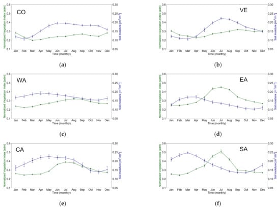 Figure 2 presents the long-term mean annual cycles of NDVI and soil moisture in the study regions. It is worth noticing that the maximum and minimum values of SMOS tend to lead those of NDVI by 2–4 months, depending on each region. The annual cycles of both variables exhibit different phases (months associated with peak values), and in some regions tend to be in phase, whereas in other regions tend to be out of phase.