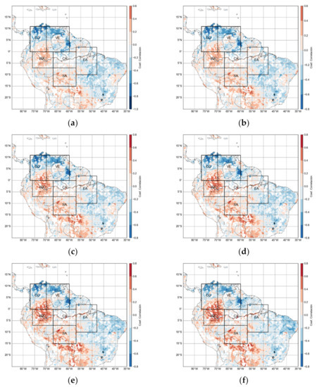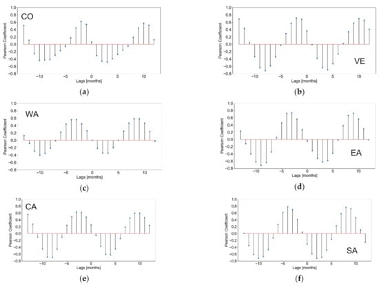 Lagged cross-correlations between monthly series of regionally averaged values of NDVI and SMOS over the studied regions. Negative lags denote SMOS leading NDVI, and positive lags denote NDVI leading SMOS. (a) CO: Colombia, (b) VE: Venezuela, (c) WA: West Amazonia, (d) EA: East Amazonia, (e) CA: Central Amazonia, and (f) SA: South Amazonia.