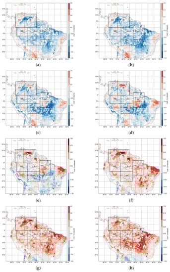Figure 4. Maps of pixel-by-pixel lagged cross-correlations between NDVI and SMOS. Results show NDVI leading SMOS by: (a) 4 months; (b) 3 months; (c) 2 months; (d) 1 month; (e) 0 (simultaneous). Results for SMOS leading NDVI by: (f) 1 month; (g) 2 months; and (h) 3 months.