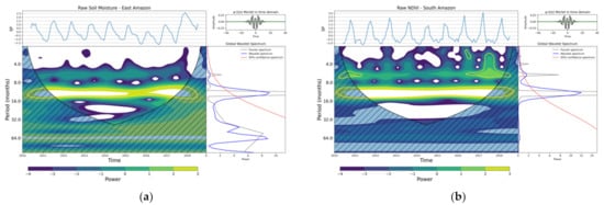 Wavelet analyses of the raw monthly series of NDVI and SMOS indicating that the highest portion of the variance is located in the 12-month frequency band: (a) SMOS—EA region; (b) NDVI—SA region.