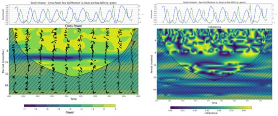 Owing to the definition of the wavelet coherence analyses (WCO), a value of 1 indicates a linear relationship between the two times series at time ti on a scale frequency s, whereas a value of zero indicates null correlation [66]. Results of the WCO analyses shown on the right panel of Figure 6 for all regions indicate that both signals exhibit a strong correlation (yellow) at a wide range of frequency bands, ranging from 2 to 32 months. Cycles shorter than 6 months are abundant and short, possibly owing to the influence of the intra-seasonal or Madden–Julian oscillation on rainfall [67], and the consequent effect on vegetation activity and soil moisture.