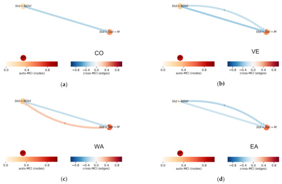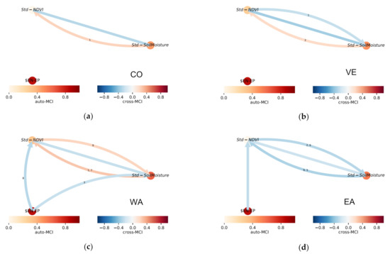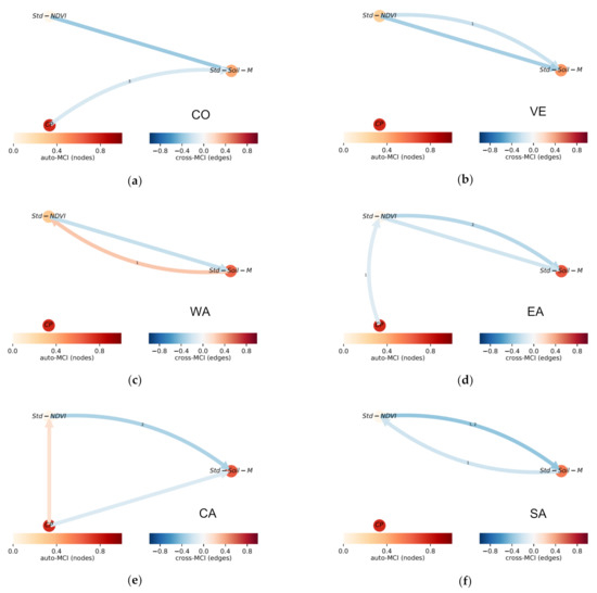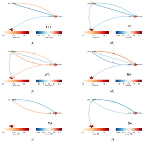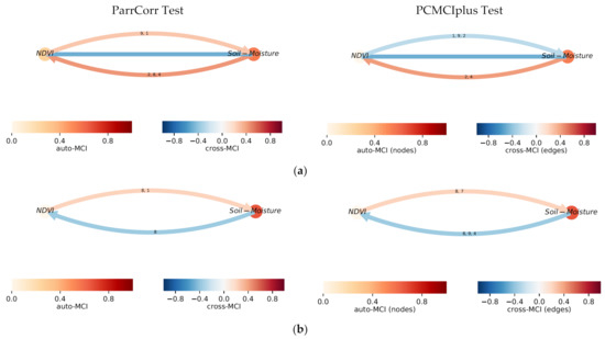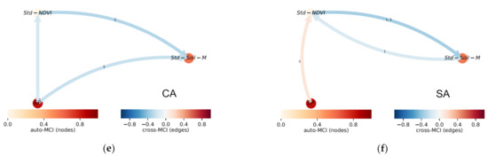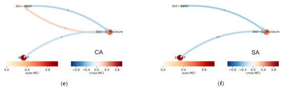 Additionally, estimated values of the nonlinear temporal auto-causalities of both NDVI and SMOS allow us to conclude that soil moisture memory is stronger than NDVI, as per the colors of the nodes in Figure 7, Figures S8 and S9: where the color of auto-MCI varies between 06–0.8 for SMOS and between 0.0–0.6 for NDVI (see Tables S1 and S2).