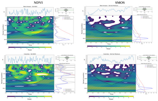 Figure 5 shows the continuous wavelet transforms of both NDVI and SMOS raw monthly series for EA and SA, respectively. There is a clear-cut common feature in the wavelet spectra of both time series, namely the significant peak at the 12-month frequency band throughout the entire record length, which becomes more evident in the Fourier and the wavelet spectra. Time series of SMOS also exhibit an important spectral peak at the 64-month frequency band, mostly associated with ENSO, albeit located inside the non-significant cone of influence. Such a 64-month spectral peak only appears in time series of NDVI for the Western Amazon (WA). The strongest intra-annual variability occurs in Colombia, mostly due to the semi-annual cycle associated with the passage of the ITCZ, twice a year, mainly over the Andean region [64,65].