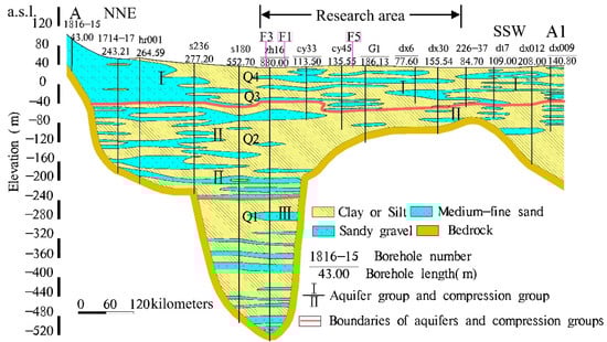 Hydrogeological profile (the geological data are derived from [53,57]). The aquifer system can be vertically divided into three main aquifer groups: the first compression group (Q4 + Q3), the second compression group (Q2) and the third compression group (Q1).