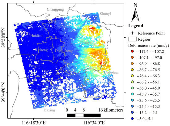 According to the methodology, the deformation rate map of the study area was obtained (Figure 4). The red points denote a negative deformation, thus indicating that the targets are far away from the satellite along the LOS. The blue points denote a positive deformation, thus indicating that the targets are close to the satellite along the LOS. A total of 950,789 PS were identified within 1250.5 km2, leading to a PS density of 760 PS/km2. The study area had large deformation rates, ranging from −117.4 to +5.1 mm/y between April 2010 and December 2019. The main land subsidence areas were in Chaoyang District and Tongzhou District. The InSAR measurement results were in good agreement with the leveling measurement results (Figure 5). The root mean square error (RMSE) was 4.0 mm/y.