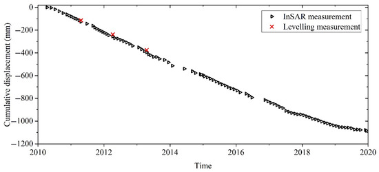 Furthermore, we obtained four leveling measurement values of two benchmarks to evaluate the accuracy of the InSAR results. Firstly, the nearest point of each benchmark was used as the value of the InSAR result. Then, the Line of Sight (LOS) value of the InSAR result was projected onto the vertical direction according to the incident angle of the images. Finally, one benchmark was used as a reference to correct the other benchmark.