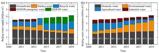 - In the past 10 years, Beijing’s water supply and consumption structure have undergone great changes. Increases in SNWDP water and recycled water have gradually improved the current situation of water resources, making the groundwater level increase year by year. As public park area expanded, environmental water consumption increased year by year. Although the resident population of Beijing has decreased, domestic water consumption has increased year by year due to changes in people’s water usage. With changes in the water supply structure (the increase in SNWDP and recycled water, and the reduction in groundwater exploitation) and the optimization of water consumption (recycled water for environmental water, and the reduction in agricultural water), groundwater levels began to rise after 2015.