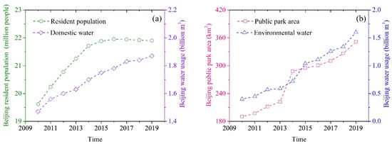 (a) The relation between resident population and domestic water. (b) The relation between public park area and environmental water.