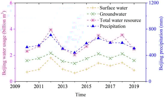 The combination of surface water and groundwater is called the total water resource. Precipitation and its spatiotemporal distribution in Beijing have an important impact on the total amount of water resources [60]. The correlation coefficient between the total water resource and precipitation is very high (Figure 8), which is the same with previous studies [56,60]. Due to extremely increased precipitation, there was a brief rise in groundwater levels in 2012. The average precipitation in Beijing is 585 mm, which is much higher than the average values in 2010, 2011, 2013 and 2014. Decreases in precipitation aggravated the decline of groundwater levels, especially in the dry year of 2014 (Table 3). In addition, the SNWDP was completed on 7 December 2014, which transports water from southern China to Beijing. The average annual transportation is about 1.0 × 109 m3 of water, which alleviates the impact of precipitation on groundwater to a certain extent. In addition to the influence of precipitation in 2012, the groundwater levels show a continuous decline from 2010 to 2015. The maximum level of average groundwater appeared at 25.75 m in 2015, which decreased by 0.83 m compared to that in 2010. It is worth noting that, from 2010 to 2019, the average groundwater levels reached a major turning point in 2016. The SNWDP water was continuously transported to Beijing, reversing declines in groundwater levels. Compared with the lowest point in 2015, the average groundwater level in 2019 increased by 3.04 m.