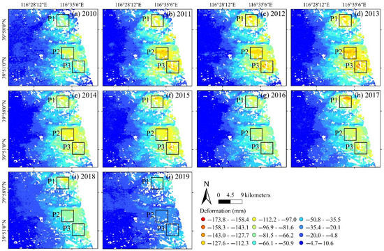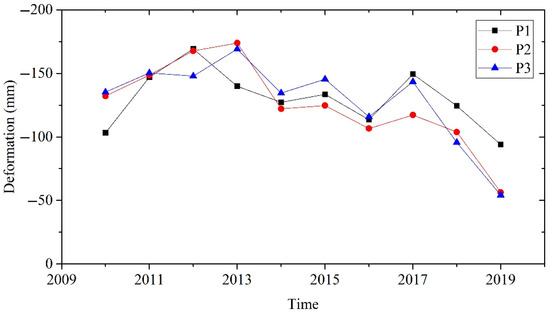 Combined with changes in groundwater level, we analyzed the impacts on land subsidence. Land subsidence at three typical deformation centers are shown in Figure 9a–j. We found that land subsidence has changed significantly spatially from time. The changes in groundwater levels and land subsidence had a certain lag. After 2015, the groundwater levels rose year by year, leading to a slowdown in land subsidence in the following years, especially for the land subsidence of the Jinzhan deformation center (P1), Sanjianfang deformation center (P2) and Heizhuanghu deformation center (P3), which have decreased significantly. The time series displacement evolution process at each deformation center is shown in Figure 10. P1 reached a maximum deformation of −169.2 mm in 2012 and a minimum value of −93.9 mm in 2019. The deformation of P2 changed the most out of the three deformation centers, with a maximum value of −173.8 mm in 2013. Then, the deformation continued to decrease, with a minimum value of −56.3 mm in 2019. P3 also reached a maximum value of −169.1 mm in 2013, but the deformation suddenly began to increase in 2017. Then, the deformation continued to decrease, with a minimum value of −54.1 mm in 2019.