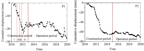 We defined the “life cycle” of the subway as the construction period and the operation period. Land subsidence covers the construction period of Line 6 from April 2010 to December 2012 and the operation period of Line 6 from December 2012 to December 2019. The construction period of Line 7 was from April 2010 to December 2014, and the operation period of Line 7 was from December 2014 to December 2019. The monitoring time spans the entire life cycle of Line 6 and Line 7 from 2010 to 2019. During the construction period, we found that there was land subsidence about 500 m to the east of the Dongsi station on Line 6, and the time series displacement of typical P1 was drawn, as shown in Figure 12. The tunnel of the Dongsi station section was drilled by the drill and blast method. The tunnel has a height of 6.5 m, a width of 6.2 m and a depth of 33 m, mainly located in sand or gravel. The construction period is divided into four stages. In stages Ⅰ–Ⅲ of the construction period, the displacement of P1 began in August 2010, sinking approximately linearly until the maximum displacement reached −23.3 mm in February 2012. Then, in stage Ⅳ of the construction period, there was a short uplift of about 8 mm over a period of about 7 months, and it finally stabilized. During the operation period of Line 6, P1 was relatively stable, but there was slow displacement of about 12 mm from July 2017 to December 2019. In addition, we also found that there was land subsidence during the construction period at Ciqikou station on Line 7, and the time series displacement of typical P2 was drawn, as shown in Figure 12. During the construction period of Line 7, the displacement of P2 lowly sank from April 2010 to September 2011, reaching −9.6 mm. Then, the displacement began to accelerate until January 2013, with a displacement of about 48 mm in just 16 months. Finally, it tended to be stable, and there was no obvious displacement during the operation period.