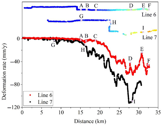 Deformation rate profile of Line 6 and Line 7. The x-axis represents the distance from the west endpoint to the east endpoint. (A) Dongsi Station, (B) Chaoyangmen Station, (C) Hujialou Station, (D) Dalianpo Station, (E) Changying Station, (F) Caofang Station, (G) Ciqikou Station, (H) Huagong Station, (I) Heizhuanghu Station.