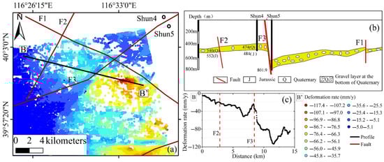 (a) Distribution of land subsidence in active fault areas. (b) Profile of the Shunyi fault. (derived from [57]). (c) Profiles of deformation rates on both sides of the faults (B-B’).