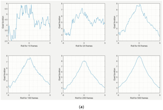 Figure 6. The intersection of goal function F in the whole range of angles of roll, pitch, and yaw, from −180° to 180°. For each chart, one angle is presented on the axis X and other two angles are set to 0. (a) Roll for 50 frames, (b) Pitch for 50 frames (c) Yaw for 50 frames.