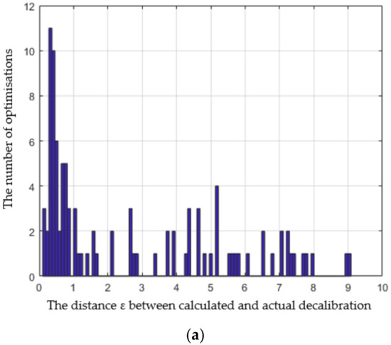 Figure 8. Histogram of distances between the minimum found by the algorithm and the point corresponding to the actual value of decalibration. The goal function was calculated from 50 (a) and from 100 (b) frames.