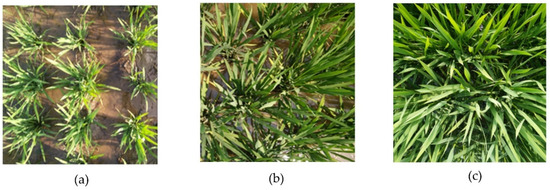 The appearance of rice at different growth stages: (a) tillering stage, (b) jointing stage, and (c) booting stage.