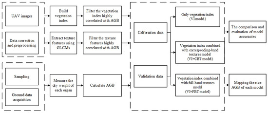 Previous research has shown that integrating spectral–spatial information could alleviate the saturation phenomenon as compared with using spectral information alone [12]. Three phenology stages before the flowering stage were considered: the tillering stage, the jointing stage, and the booting stage. The workflow for model construction included the following steps (Figure 4): (1) Correlation analysis was used to select the top ten vegetation indices highly correlated to AGB in each kind. Stepwise multiple regression was subsequently applied to extract the optimal textures and VIs; (2) Quantitative relationships between the optimal vegetation indices, texture features, and AGB were analyzed, and the multiple regression method was used to establish the VI, VI+CBT, and VI+FBT models; and (3) Accuracy assessments were conducted to evaluate the effect of each model.
