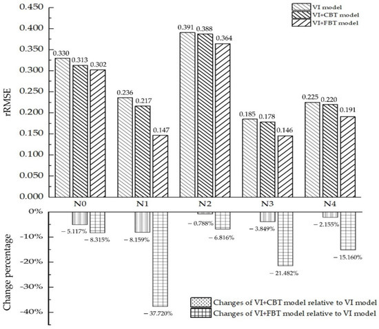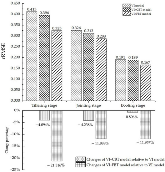 The rRMSEs of estimated AGB using VI model, VI+CBT model, and VI+FBT model under different nitrogen levels and the percentage changes of VI+CBT model and VI+FBT model relative to VI model (note: the presented values were rounded to three decimals for the sake of simplicity).