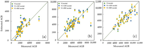 Scatter plot of AGB estimation with three models in each growth stage. (a) Tillering stage, (b) jointing stage, (c) booting stage. Green: vegetation index model (VI model); blue: vegetation index combined with corresponding-band textures model (VI+CBT model); yellow: vegetation index combined with full-band textures model (VI+FBT model).