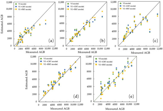 Scatter plot of AGB of three models under different nitrogen levels: (a) N0, (b) N1, (c) N2, (d) N3, (e) N4. Green: vegetation index model (VI model); blue: vegetation index combined with corresponding-band textures model (VI+CBT model); yellow: vegetation index combined with full-band textures model (VI+FBT model).