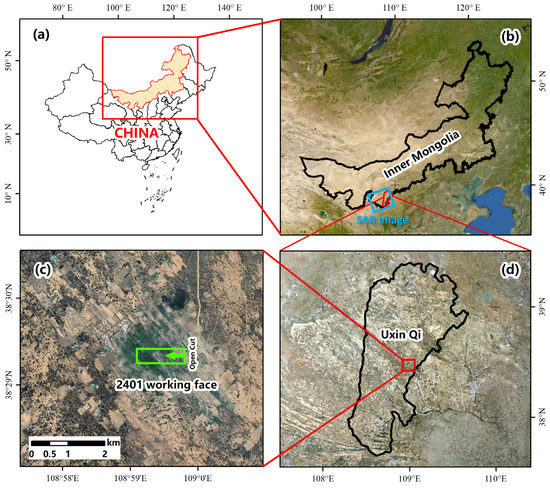 Location of the study area. (a) Position at the national level in China. (b) Position in Inner Mongolia Province. Blue rectangular frame is the cover range of SAR Images. (c) Position in Uxin Qi. (d) 2401 working face layout. The direction indicated by the green arrow is the advancing direction of the working face.