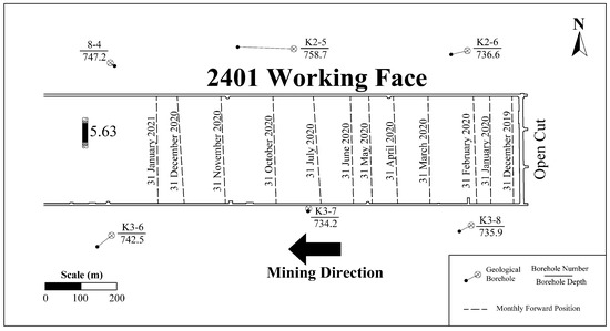 Layout of the 2401 working face and the monthly forward position.