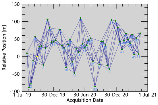 First, the temporal baseline and spatial baseline thresholds were set to 60 days and 2% of the critical limit to generate as many connected image pairs with a good coherence as possible. The generated spatio-temporal baseline connection maps are shown in Figure 5.