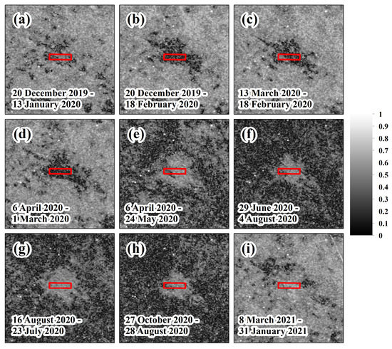 Coherence images. Subfigures (a–i) are the coherence images corresponding to the image pairs in Table 3. The layout of the 2401 working face is marked by the red rectangle.