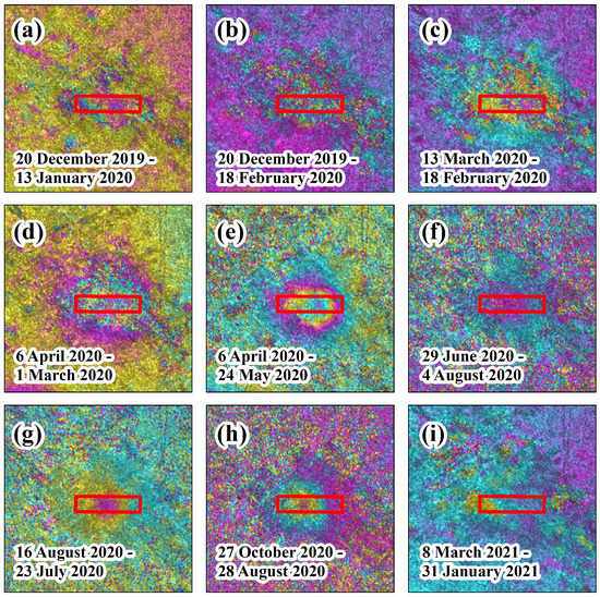 Interference images. Subfigures (a–i) are the interference images corresponding to the image pairs in Table 3. The layout of the 2401 working face is marked by the red rectangle.