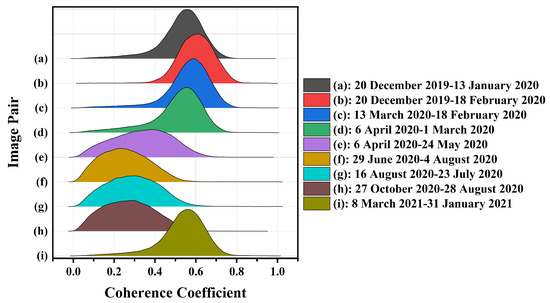 Statistical distribution of coherence coefficient. Subfigures (a–i) are the Statistical distribution of coherence coefficient corresponding to the image pairs in Table 3.