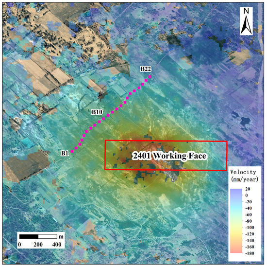 The annual average subsidence rate of the ground surface and the layout of leveling points in the study area. B1–B22 are the point numbers of level measurement points. The layout of the 2401 working face is marked by the red rectangle.