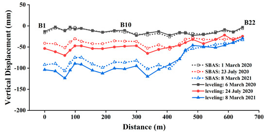 In order to verify the SBAS-InSAR settlement monitoring results, leveling measurement data were collected at the surface around the 2401 working face in this study. The leveling observation line was located at the northwest side of the 2401 working face, as shown in the Figure 9, which consisted of 22 measurement points (B1–B22) in total and was laid along the road. A total of four observations were conducted. The first observation date was 2 December 2019, and the remaining observation dates were 6 March 2020, 24 July 2020 and 8 March 2021, respectively.