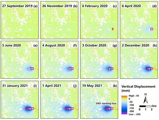 The dynamic evolution process of surface subsidence basin in the study area. Subfigures (a–k) show the distribution of cumulative surface subsidence in the study area at different dates. The layout of the 2401 working face is marked by the red rectangle.