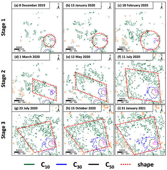 - Stage 3: Trapezoidal. During the period from 11 July 2020 to 31 January 2021, expanded mainly to the north, further merging the sporadically developed subsidence area directly to the north. The newly developed sporadic subsidence area expanded toward the northeast side of the boundary curve.