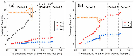 Relationship between coverage area of the surface subsidence basin and advancing length of the 2401 working face. (a) Coverage area of subsidence value over 10 mm. (b) Coverage area of subsidence value over 30 and 50 mm.
