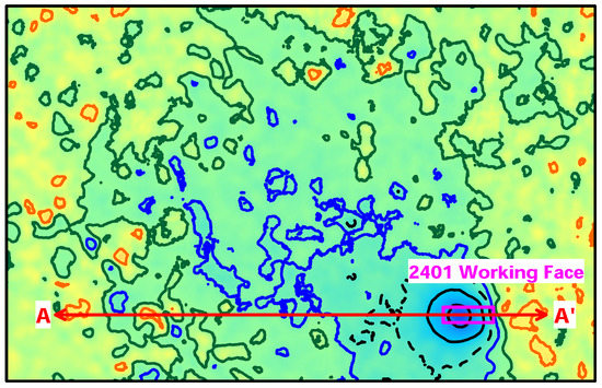 First of all, it can be obviously recognized that the contour is more cluttered, which is increasingly serious as time passes backwards. The contours and are relatively distinct. Secondly, all three contours experienced different degrees of change during the advancement of the 2401 working face from east to west.