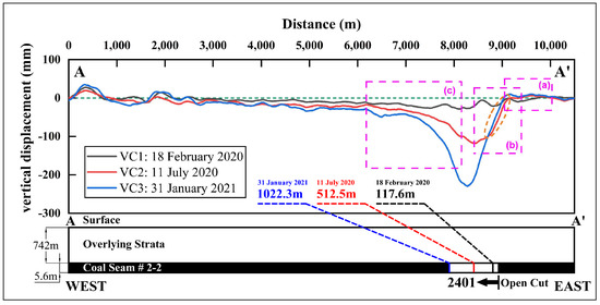 Cumulative vertical displacement curves on the profile line AA′. (a) is the area where ground uplift occurs directly above the open cut. (b) is the area where ground uplift occurs to the east of the open cut. (c) is the area where the overall ground subsidence occurs in front of the working face.