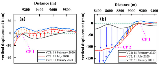 Within the region shown in Figure 16a, the vertical displacement from the ground surface is dominated by a slight uplift of less than 20 mm. There exists an intersection point of vertical displacement curves VC1 and VC2, abbreviated as CP1. During the transition from VC1 to VC2, the relative vertical displacement of the surface on the left side of CP1 is in the form of subsidence, while on the right side, it is in the form of an uplift. It indicaes that the surface in region (a) underwent a rotation with CP1 as the center from 18 February 2020 to 11 July 2020. The above rotation phenomenon also existed between 11 July 2020 and 31 January 2021. Only the center of rotation was shifted from CP1 to CP2 along the advancing direction of the working face, as shown in Figure 16b. Therefore, it can be concluded that the uplift on the east side of the open cut is actually part of the overburden rotation. Studies [52,53] have shown that the thicker the rock stratum is, the higher the bearing capacity it has and it is more prone to rotation. The thickness of the Cretaceous Zhidan Group rock formation in the strata of this study area is generally over 300 m. Therefore, it is likely that the ultrathickness of the weak stratum caused the rotational motion characteristics during the overburden movement.