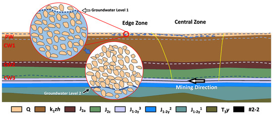 The study area is scarce of surface water, but is abundant in groundwater resources, which can meet the water demand of local residents for living and production. According to the borehole pumping data of the Yingpanhao coal mine, there are mainly four aquifers in the overburden of the 2-2 coal seam, as shown in Figure 2. From the surface downward, they are: pore phreatic aquifer PW, confined aquifer CW1, Middle Jurassic () confined aquifer CW2, and bottom to 2-2 coal seam confined aquifer CW3. The main information of each aquifer is shown in Table 1. The unit water inflow q and permeability coefficient K of each aquifer were determined by steady flow single-hole tests (drop depth of 10 m, steady pumping time of 8 h, and caliber of 91 mm). The phreatic aquifer PW is mainly supplied by atmospheric precipitation and lateral runoff in adjacent areas. At the same time, the phreatic aquifer has a certain hydraulic connection with the lower confined aquifer CW1. The confined aquifer CW1 has a high porosity, strong water permeability and conductivity, which forms a good storage space for groundwater and is the main aquifer in this area. The hydraulic connection between the CW1 and the lower confined water aquifer is small, and further down, the confined aquifers CW2 and CW3 are weakly water-rich with poor permeability and hydraulic conductivity. In the formation , , and , there are multiple layers of mudstone, sandy mudstone, and siltstone with thin thickness, dense lithology, and poor permeability. Consequently, they can be regarded as the relatively impermeable layers.