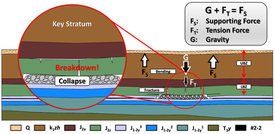 The theory of the three-zone distribution [59] in the extraction area divides the overburden into a collapse zone, a fracture zone, and a bending zone from bottom to top. With the extension of the mining area, the development height of the collapse zone and the fissure zone gradually increases, while the thickness of the bending zone gradually reduces. Considering the stratigraphic structural characteristics of the study area, it is clear that the giant thick Cretaceous weakly cemented sandstone layer is the key strata controlling surface subsidence and is also the major component of the bending zone. Bounded by the rock floor, the bending zone is further divided into two regions. Taking the floor of the rock stratum as the boundary, the bending zone is further divided into two regions, namely the upper bending zone (UBZ) and the lower bending zone (LBZ). Before mining activities, the LBZ zone basically has an upward supporting force on the UBZ. As the working face continuously advances, the supporting force gradually decreases until it reaches zero. Subsequently, the force of the LBZ on the UBZ is transformed into a downward tension. The magnitude of the tensile force increases as L enlarges at first. However, when L reaches a certain value, the deformation of the lowermost rock in the LBZ exceeds the limit, and the breakdown occurs. As a result, the tension effect of the LBZ on the UBZ is released to a certain extent. Combined with the fact of the basin paused expansion, it can be seen that although the lateral range of the UBZ is expanded and the gravity is relatively increased, the sum of the increased gravity and the decreased tension does not change significantly, but is exactly balanced with the support force of the surrounding rock body on the UBZ. After the broken section reaches a certain range, the increase of gravity exceeds the decrease of tension, so the equilibrium state of the UBZ is broken again, and the surface continues to deform synchronously with the giant thick weakly cemented rock layer.