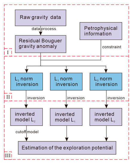 Regarding a real field survey, the estimation of exploration potential comprises three main steps (Figure 1). Firstly, the raw gravity data were processed to obtain residual Bouguer gravity anomalies; these procedures include various corrections, field separation, and denoising. Furthermore, petrophysical information was gathered from the literature and rock sample measurements. Secondly, we adopted different norm-based inversions in cooperating with the petrophysical information to obtain recovered models. Finally, the recovered model was utilized to perform an estimation of the exploration potential. Since gravity data and density distribution correlate directly, the exploration potential was estimated by multiplying the exploration target involved volume and inverted density. In particular, the L2 norm inverted model had smooth features, so a cutoff process was required to extract the cropped model relevant to the exploration target. The remainder of this section focuses on the inversion method (light blue parts in Figure 1) and presents the details related to the forward modeling and inversion equipped with different norms.