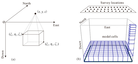 Considering the Cartesian coordinate systems, we adopted the coordinates (x, y, z) for a survey point and (ξ, η, ζ) for a geological body (Figure 2a). The vertical axes (z and ζ), the north axes (x and ξ), and the east axes (y and η) were arranged in a right-handed system. The gravity effect g caused by a rectangular cell with a constant density ρ at survey point (x, y, z) is given by [36]