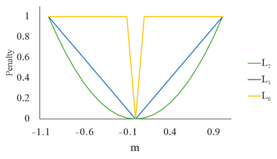 where ε is a small number to avoid singularity and is set to 10−10. Figure 3 illustrates the penalties for different norms. Theoretically, the L2 norm is very sensitive to the amplitude of the model parameter due to squaring. While the L2 norm is the most common usage, it is mostly blind to geometry and tends to recover model with smaller parameters than the actual case. The L1 norm inverted model could be interpreted as a minimal geometric description, which is somewhat sensitive to amplitude information. Most of the model parameters restored using the L1 norm tend to be zero, and a small number of model parameters have high values. However, the boundary of the target was blurred due to the nature of the L1 norm. The L0 norm was the least amplitude-dependent norm since it was counted regardless of the magnitude (if the absolute value of a number is raised to the power of 0, then it is 1 or 0). During the minimization, the vast majority of model parameters became 0, and only a few model parameters, used to characterize the geological bodies, had non-zero value and sharp-boundary features [46]. To sum up the above, the inversion equipped with the L0 norm tended to provide more robust and interpretable results than other norms.