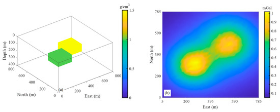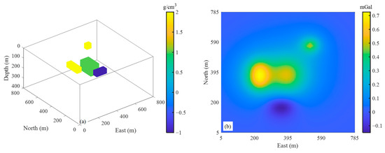 To illustrate the effectiveness of the gravity inversion with different model norms on exploration potential estimation, we present the results of their application to synthetic gravity data produced by a two-block model shown in Figure 4a. Two blocks are parallelepipeds of dimensions 100 × 100 × 100 m, situated at 50 and 100 m depths. The densities of the southwest and northeast blocks are 1 g/cm3 and 1.5 g/cm3, respectively. The gravity data caused by two blocks are simulated at equidistant stations laterally spaced at 20 m with a height of 1 m, shown in Figure 4b. All data are contaminated with 2% Gaussian noise to simulate the real scenario.