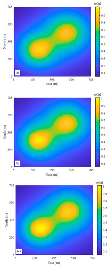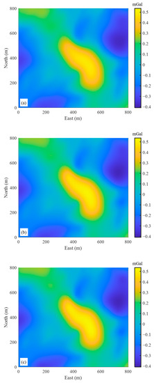 Predictions of the field gravity anomalies from the inverted models using the (a) L2, (b) L1, and (c) L0 norm penalties.