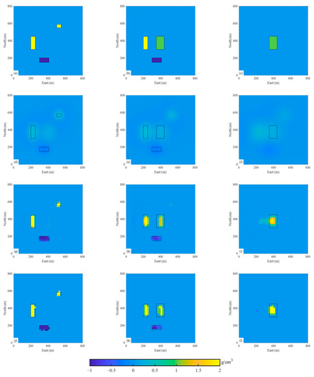 It was found that the L2 norm-based inversion tended to produce a smooth model (Figure 5d–f), which can only roughly show the locations of the density bodies; however, the geometries and edges of the density bodies are very far from the ground truth (Figure 5a–c). The inversion result using the L1 norm penalty provides a reasonable model with an improved delineation of the geometries yet has fuzzy edges (Figure 5g–i). In contrast, the L0 norm-based inversion generates a blocky model that clearly defines the density bodies’ locations and geometries (Figure 5j–l). The predicted gravity anomalies from the inverted models with three model norms are displayed in Figure 6, which all match the observed gravity anomalies at similar levels. We also found that the L2 norm-based inversion takes the least time compared to other inversions (Table 1). Furthermore, we performed exploration potential estimations using the inverted models (Table 1). Concerning the L2 norm-based inversion model, a cutoff value of 0.2 g/cm3 was used to approximate the geometries of the density bodies. Compared to the theoretical mass of 1.0 × 107 tons, the L0 norm-based inversion provided the closest estimation.