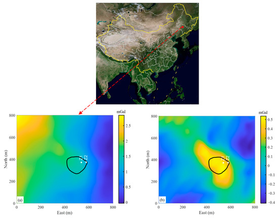 The raw gravity data were obtained in the 1970s by measuring at the surface using a quartz spring gravimeter [48]. The available data were archived as the Bouguer gravity data set that has previously been used to test the field separation [49,50]. The Bouguer gravity anomalies (Figure 10a) are digitized carefully from Figure 6 in [49]. The digitization is fulfilled using the open-source software GeoGoku [51]. The digitizing function takes the picture as input, reads contour lines interactively, and finally outputs scatter coordinates and corresponding values. In the process of reading the contour line, one needs to set the value corresponding to the contour line and then manually click the position of the contour line. Then the program will automatically recognize its position and record it. After digitization, the scattered data are re-gridded into 41 × 41 data points with a spacing of 20 m using a Taylor series expansion-based interpolator [52]. We use trend analysis to remove the regional anomalies from the Bouguer gravity anomalies. The first-order trend surface is used to characterize the regional anomalies by trial and error. The corresponding residual gravity anomalies are calculated by subtracting regional anomalies from Bouguer gravity anomalies, presented in Figure 10b. As expected, the iron-caused anomalies are highlighted. Gravity, magnetic interpretation, and drilling results show that the northwest ore body has high magnetization and density relative to the surrounding rock (Figure 10b, northwest of the enclosed black line). In contrast, the southeast ore body (enclosed black line) has low magnetization and high density relative to the surrounding rock [48,53]. From the knowledge of the drilling, the Z2 drilling finds no ore deposit, while the Z1 drilling reveals an iron orebody and its extent up to ~200 m deep [48].