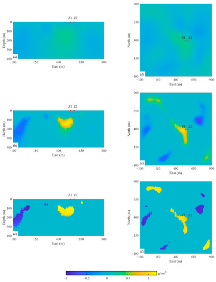 We have inverted the synthetic data using the L0, L1, and L2 model norms, as introduced in the previous section. The inversion domain is discretized into rectangular cells with a horizontal cell size of 20 × 20 m and a vertical size of 20 m for a total cell count of 32,000. The inversions of three model norms are constrained within the bound of 0–1.5 g/cm3. All of the inversions were successfully terminated when the data misfit was decreased to the tolerance. Horizontal and vertical sections of the true and inverted models are presented in Figure 5.